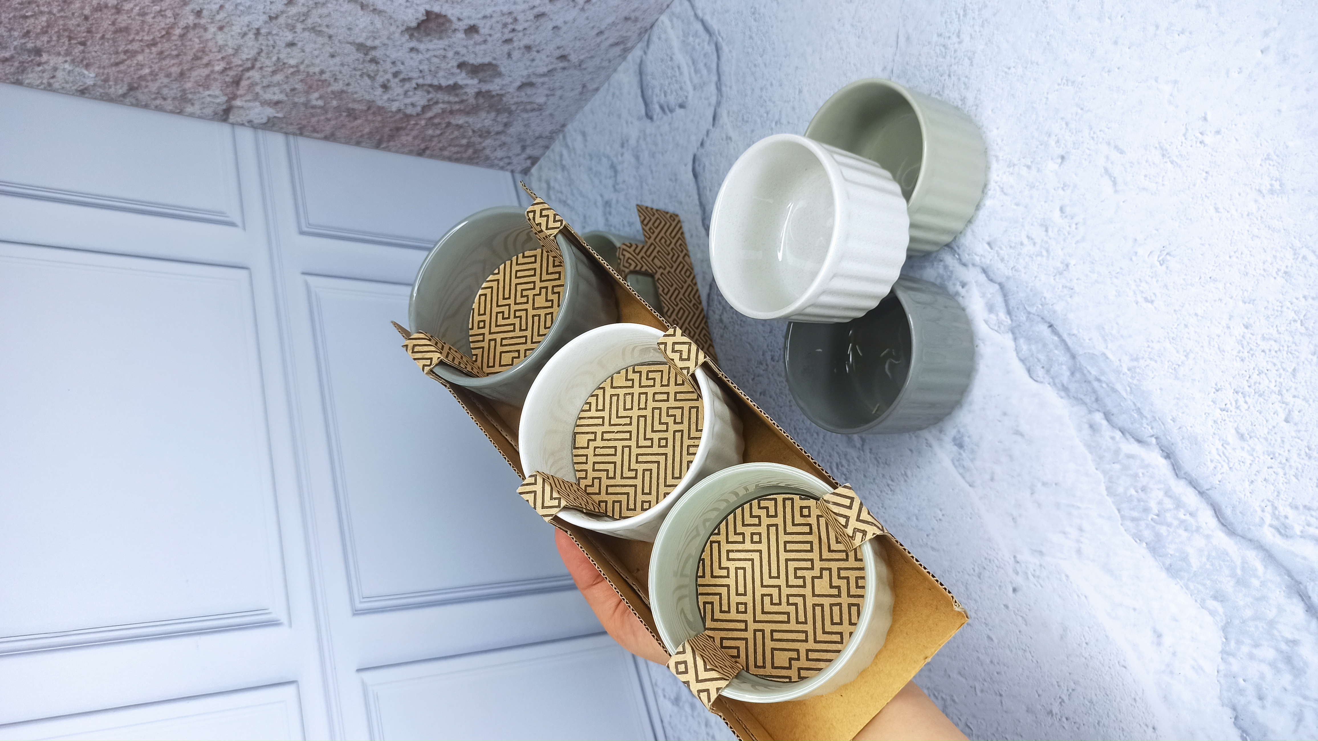 پیاله سه عددی رنگی طوسی سفید سبز برند ایکیا دارای پک مناسب هدیه