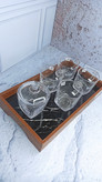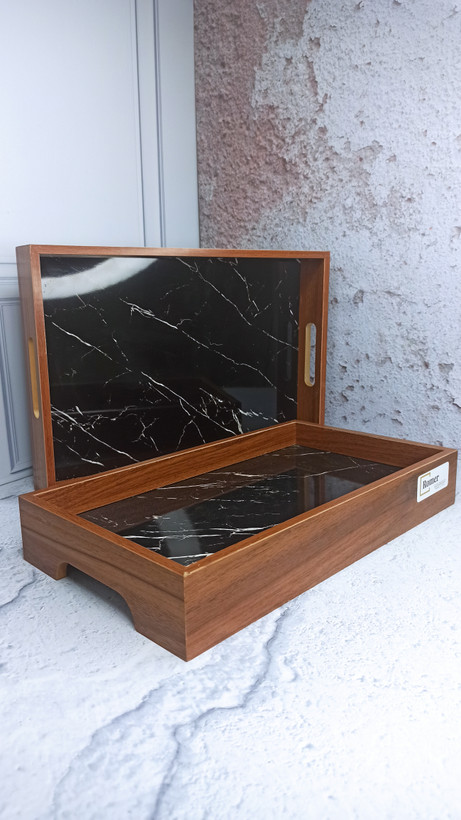 سینی چوبی کف ماربل کار بسیار شیک موجود در دو سایز عرض حدودا ۴۰ طول ۲۷ سانت و مدل کوچک تر طول ۲۳ سانت